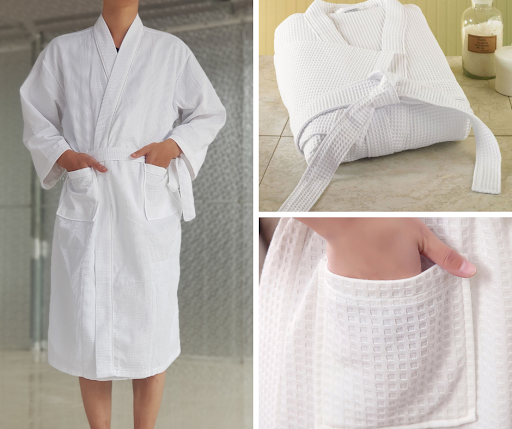 Đây là loại áo choàng tắm có chất liệu vải tổ ong với độ sáng bóng nhẹ. Ưu điểm của loại áo này là thấm hút tốt, kiểu dáng sang trọng và khá bền theo thời gian. Vì thế, các khách sạn, resort thường ưa chuộng sử dụng loại áo kimono sợi vải tổ ong.
